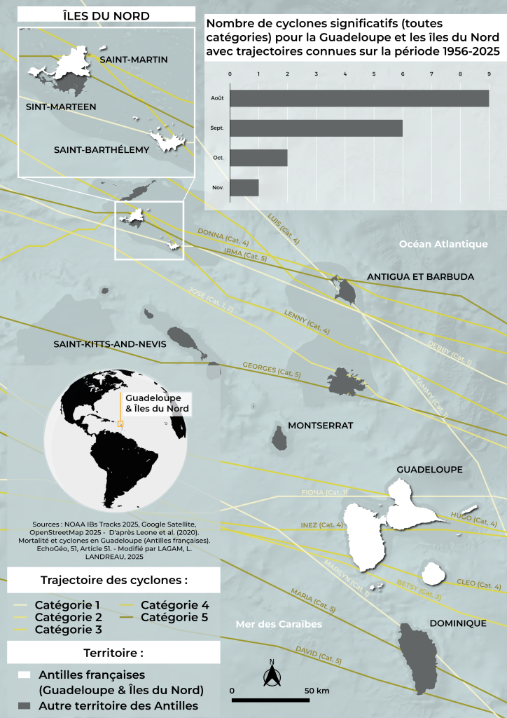 La carte ci-dessus fait état de la situation de la Guadeloupe et des îles du Nord dans leur contexte cyclonique historique sur la période 1956-2025.