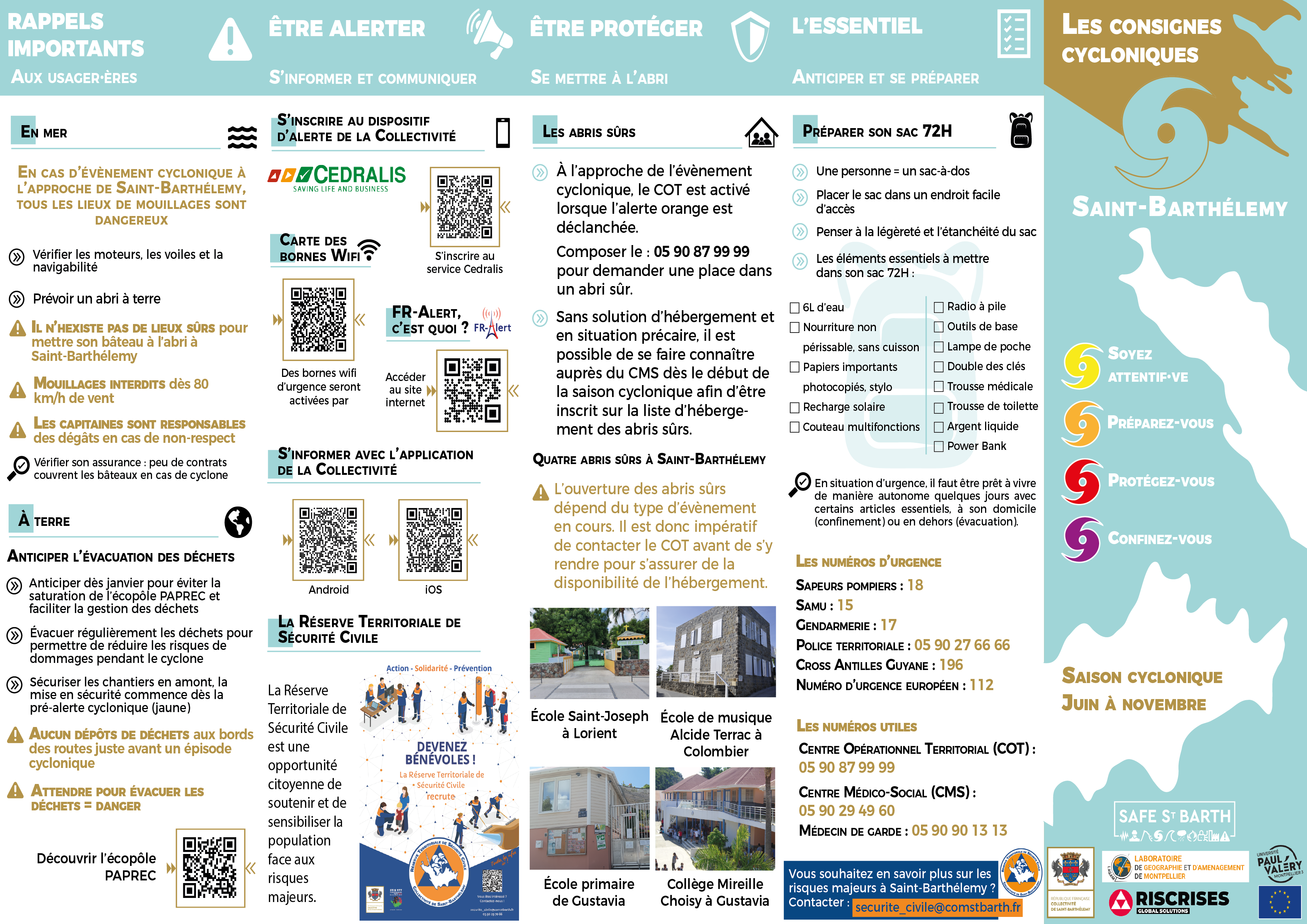 La Collectivité territoriale de Saint-Barthélemy met à disposition les brochures d’information sur la saison cyclonique sur le site internet de la Collectivité. Vous pouvez également vous inscrire et recevoir les messages d’alerte et d’information concernant la gestion des risques majeurs.
