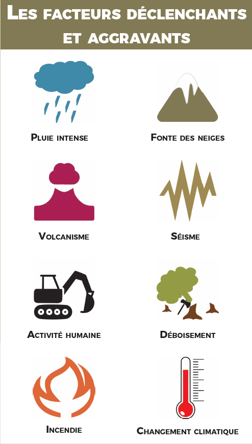 Les pluies (intensité et longue durée), les séismes, l’érosion des pieds de versants, le déboisement, la surcharge (remblaiement) à l’amont du versant, le déblaiement anthropique en aval des terrains inclinés…