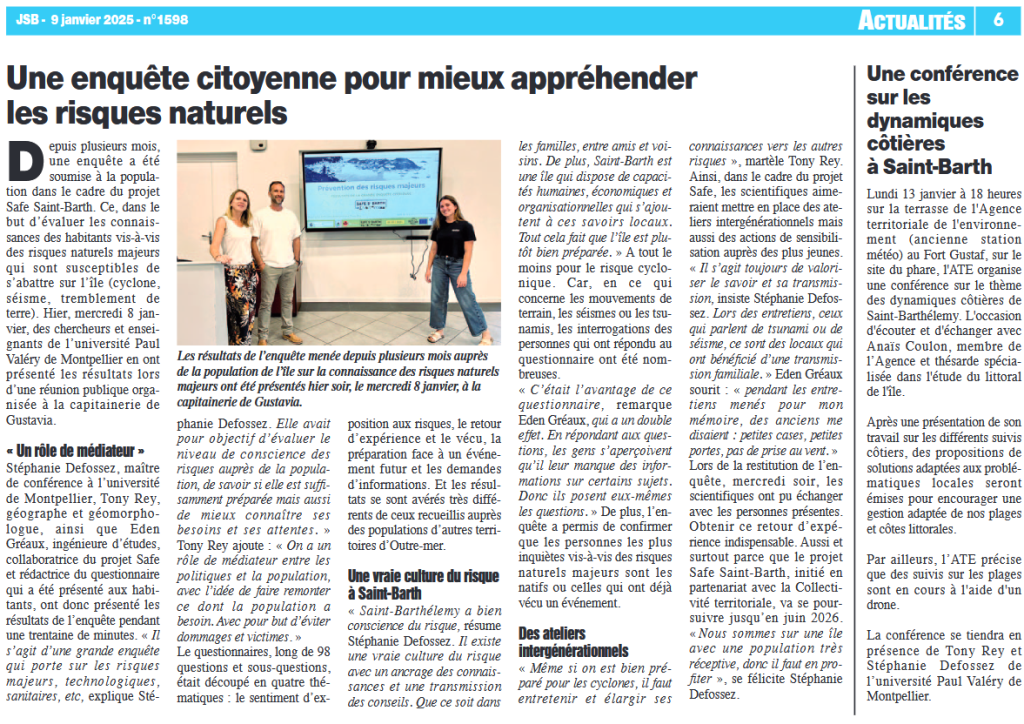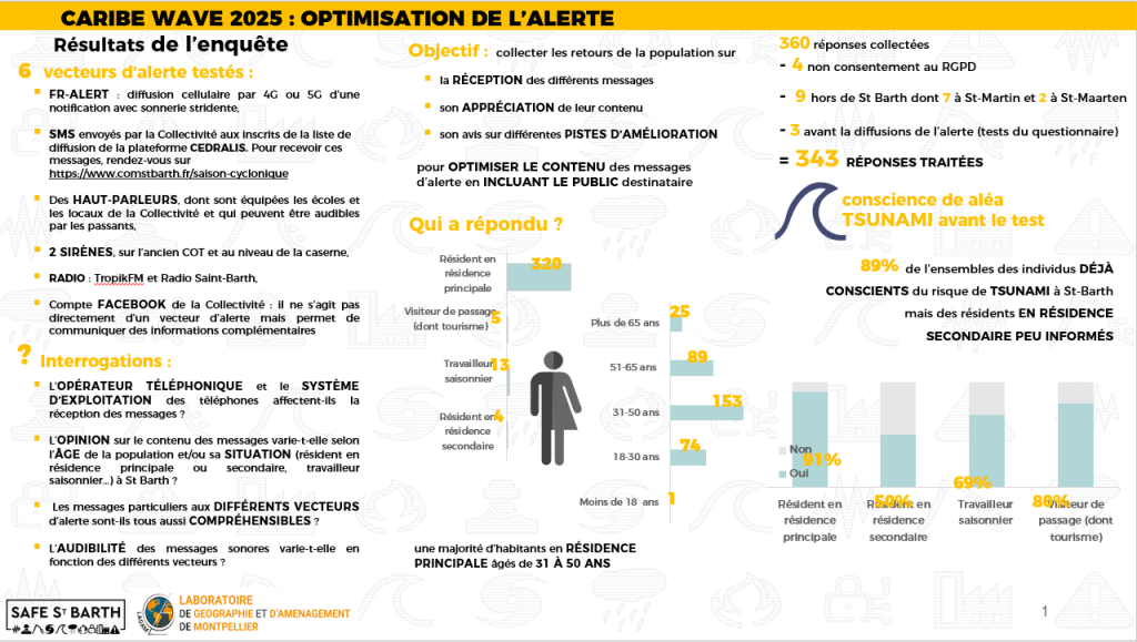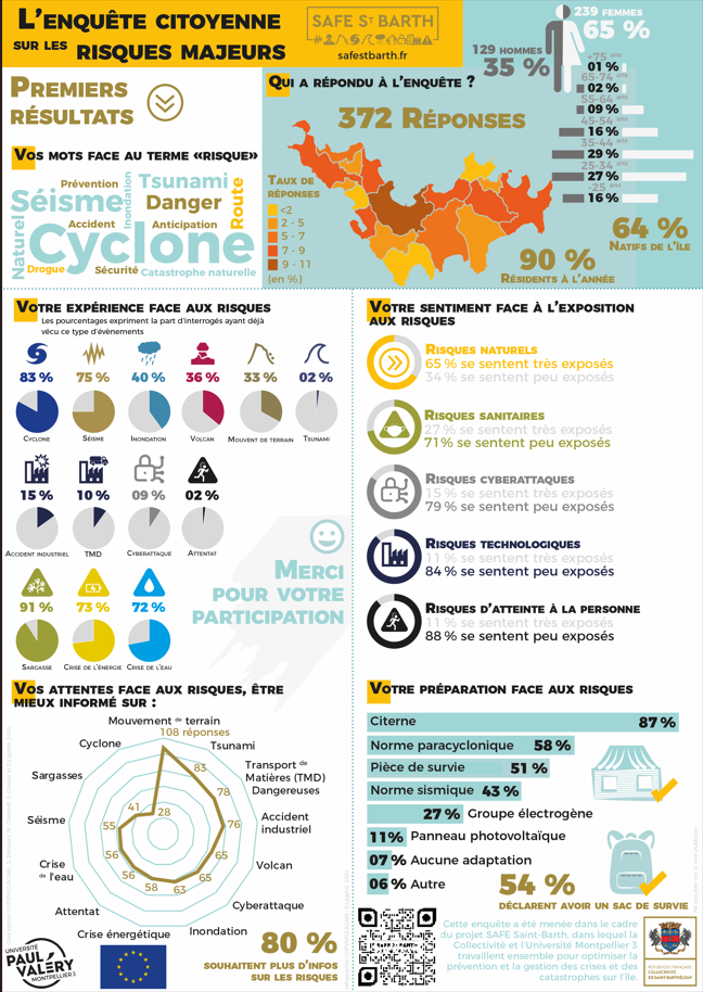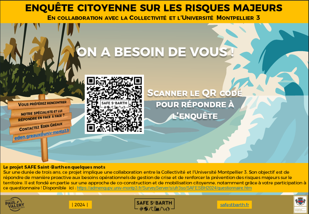 Une grande enquête sur le thème des riques majeurs a été diffusée en 2024. Les premiers résultats ont été présentés lors d’une réunion publique en janvier 2025. L’objectif était de mesurer la préparation et les attentes de la population en matière de gestion des risques majeurs. Une deuxième enquête a été menée à la suite de l’exercice Tsunami Caribe Wave en mars 2025. Il s’agissait d’évaluer les vecteurs d’alerte présents sur le territoire de Saint-Barthélemy.