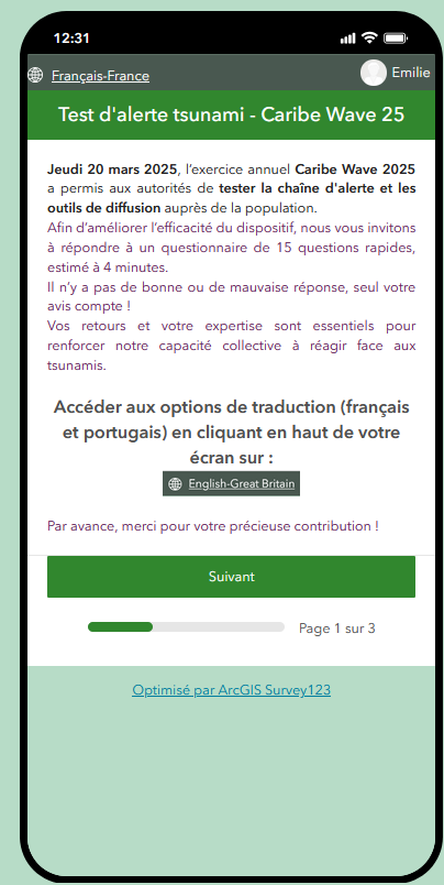 À l’issue de ce test, un questionnaire a été diffusé et traduit en trois langues (français, anglais et portugais) auprès de la population afin de recueillir des retours sur la réception, la compréhension et l’appréciation des messages diffusés. L’objectif est d’optimiser les dispositifs d’alerte en intégrant les retours des habitants dans la rédaction des futurs messages, pour renforcer leur efficacité en situation de crise. Le questionnaire explore également plusieurs hypothèses : l’influence du type de téléphone et d’opérateur sur la réception, la variation des perceptions selon l’âge ou le statut des résidents, la clarté des messages selon les vecteurs utilisés, et l’audibilité des alertes sonores.