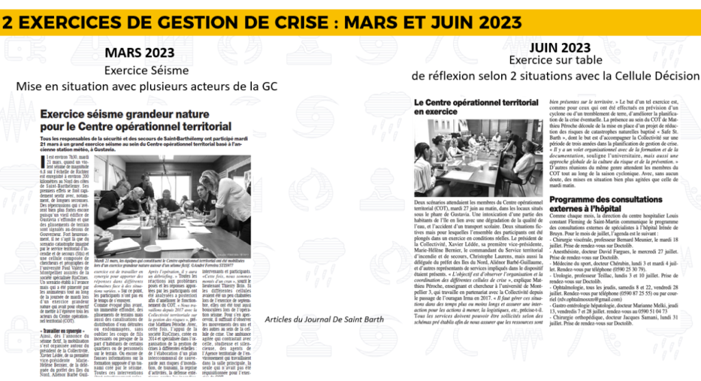 Le 21 mars 2023, un exercice grandeur nature a simulé un séisme de magnitude 6,8 au nord de Saint-Barthélemy. Coordonné par le STIS, des chercheurs de l’Université Paul-Valéry Montpellier et la société RisCrises, le scénario incluait l’effondrement d’un bâtiment, des glissements de terrain, des coupures d’eau et de fausses rumeurs de tsunami. L’objectif était de tester la réactivité et la coordination du Centre opérationnel territorial (COT), mobilisant la Collectivité, la Préfecture, les forces de sécurité et les services techniques. Les réactions ont été analysées pour améliorer les procédures de gestion de crise. Cet exercice, jugé plus abouti que celui de septembre 2022, marque une nouvelle étape dans la montée en compétence de la Collectivité en matière de préparation aux risques majeurs.