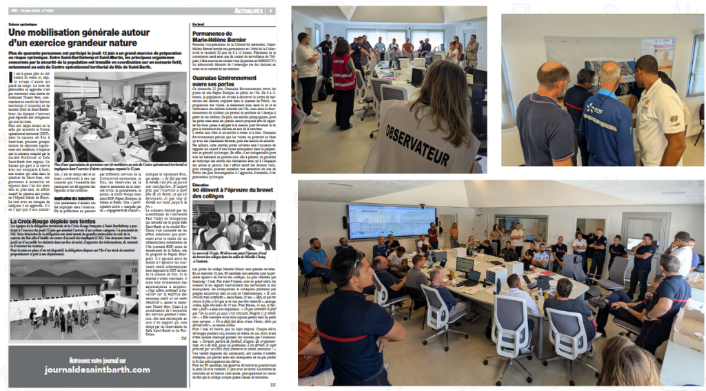 Un exercice d’Etat-Major, mené avec la Préfecture de Saint-Martin, a permis de tester le dispositif ORSEC cyclone tout en poursuivant des objectifs spécifiques pour Saint-Barthélemy : entraîner les acteurs locaux à la manipulation du prototype de PTS opérationnel, notamment son plan d’intervention gradué, et couvrir l’ensemble des temporalités de la crise (de l’ouverture de la saison cyclonique au retour à la normale). Le scénario, inspiré de l’ouragan Irma (2017), visait aussi à raviver la mémoire de crise et à renforcer la sensibilisation des acteurs.