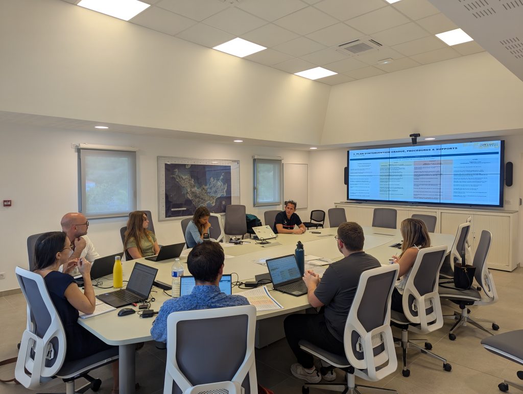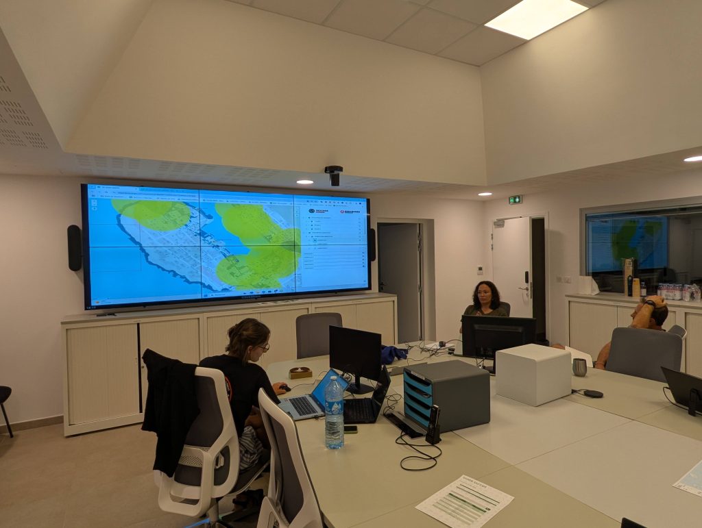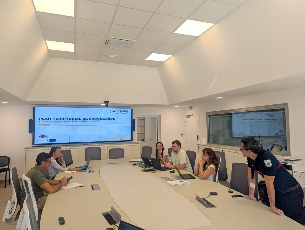 Depuis le lancement du projet SAFE Saint-Barth, plusieurs exercices de gestion de crise ont été organisés, dans le cadre de Caribe Wave ou en préparation de la saison cyclonique. Ils ont permis de renforcer la montée en compétence de la cellule de crise (COT) et sa coordination avec le STIS et les partenaires extérieurs (Préfecture, gendarmerie, hôpital, établissements scolaires). Un exercice cyclonique inter-îles, mené avec la Préfecture de Saint-Martin, a testé le dispositif ORSEC et entraîné les acteurs de Saint-Barthélemy à l’usage du prototype de PTS opérationnel, à travers un scénario inspiré d’Irma (2017). Chaque exercice, structuré par un briefing initial et un retour d’expérience collectif, a contribué à identifier les besoins, à mesurer la progression des compétences et à affiner les outils du PTS.